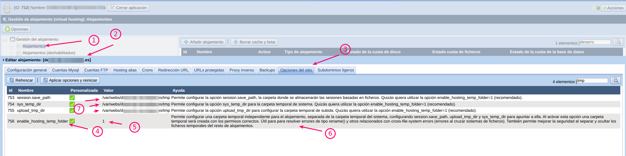 Al activar la opción enable_hosting_temp_folder = 1 (pinchar en editar opción para aplicar), esto hará que el panel cree una carpeta temporal independiente, con los permisos correctos y la ajustará en las variables sesion.save_path, sys_temp_dir y upload_tmp_dir.
