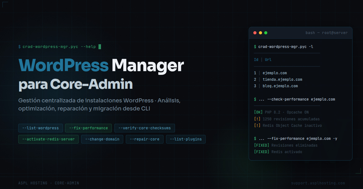 crad-wordpress-mgr.pyc es una herramienta de línea de comandos para la gestión centralizada de instalaciones WordPress en servidores administrados con Core-Admin. Permite listar, analizar, optimizar, reparar y gestionar múltiples instalaciones WordPress desde una única interfaz.
