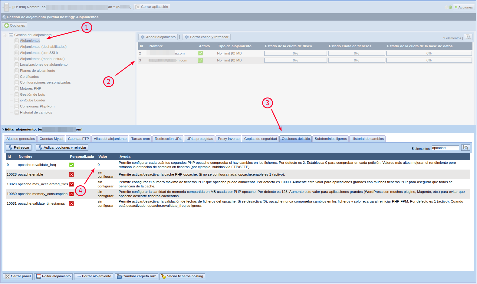 Las opciones de OPcache se configuran desde la sección Opciones de cada alojamiento web en Core-Admin.