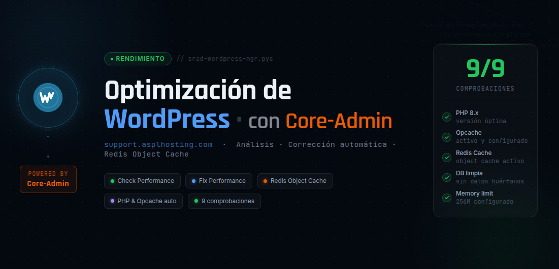 Core-Admin incluye un conjunto de herramientas integradas para analizar, diagnosticar y corregir problemas de rendimiento en instalaciones WordPress. Estas herramientas están disponibles tanto desde la interfaz web como desde la línea de comandos (crad-wordpress-mgr.pyc), y permiten: